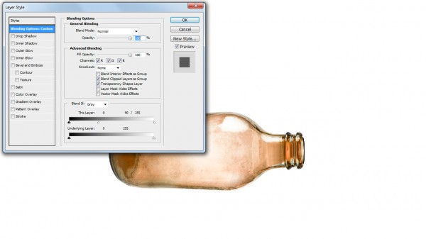 Once done, we can start to add shades and shadow to our bottle. Draw an elliptical shape and feather that selection. Then, simply fill the selection with black color on a different layer. Transform and adjust the opacity until we achieve the desired effect.